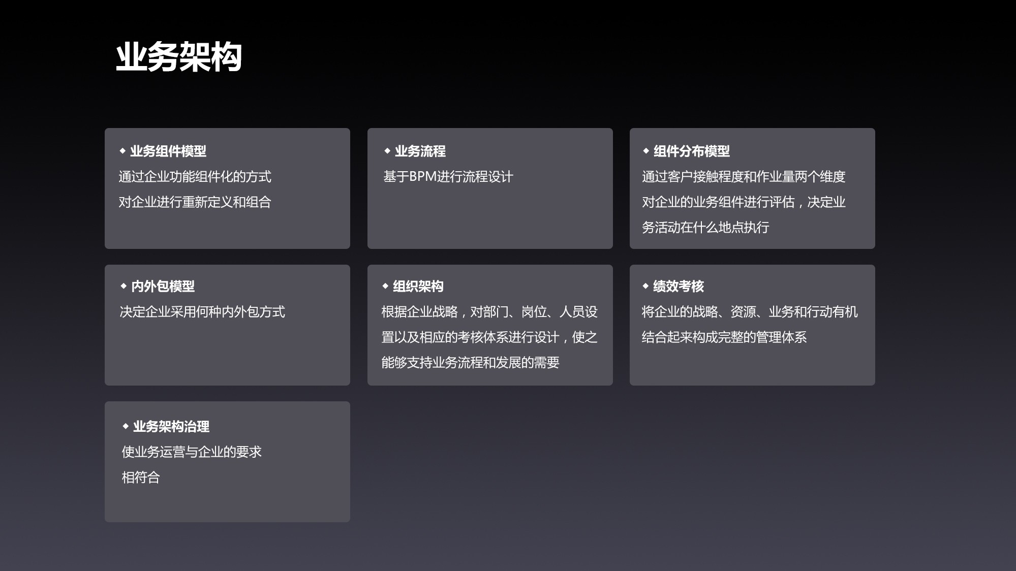 基于BPM設計業(yè)務(wù)流程,結合管理層ARC - ERP系統與“樞理”數據治理,梳理、優(yōu)化流程,消除冗余環(huán)節,提升運轉效率;借組件分布模型,從客戶(hù)接觸程度和作業(yè)量維度,評估業(yè)務(wù)組件,合理規劃業(yè)務(wù)活動(dòng)執行地點(diǎn),降低運營(yíng)成本;以內外包模型,科學(xué)決策業(yè)務(wù)外包方式,聚焦核心競爭力;依據戰略設計組織架構,適配部門(mén)、崗位、人員及考核體系,為業(yè)務(wù)流程筑牢組織支撐;通過(guò)績(jì)效考核,串聯(lián)戰略、資源、業(yè)務(wù)與行動(dòng),構建完整管理體系;依托業(yè)務(wù)架構治理,確保業(yè)務(wù)運營(yíng)貼合企業(yè)要求,讓?xiě)鹇月涞亍翱吹靡?jiàn)、摸得著(zhù)”。